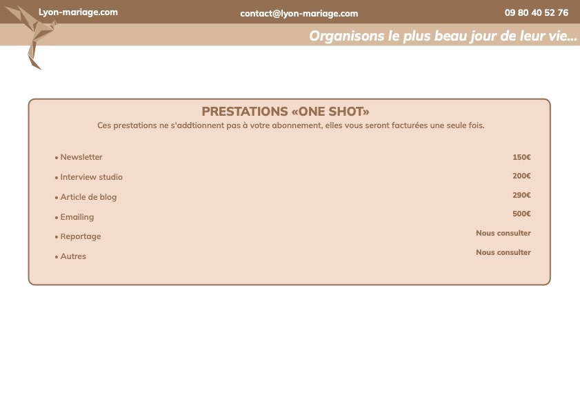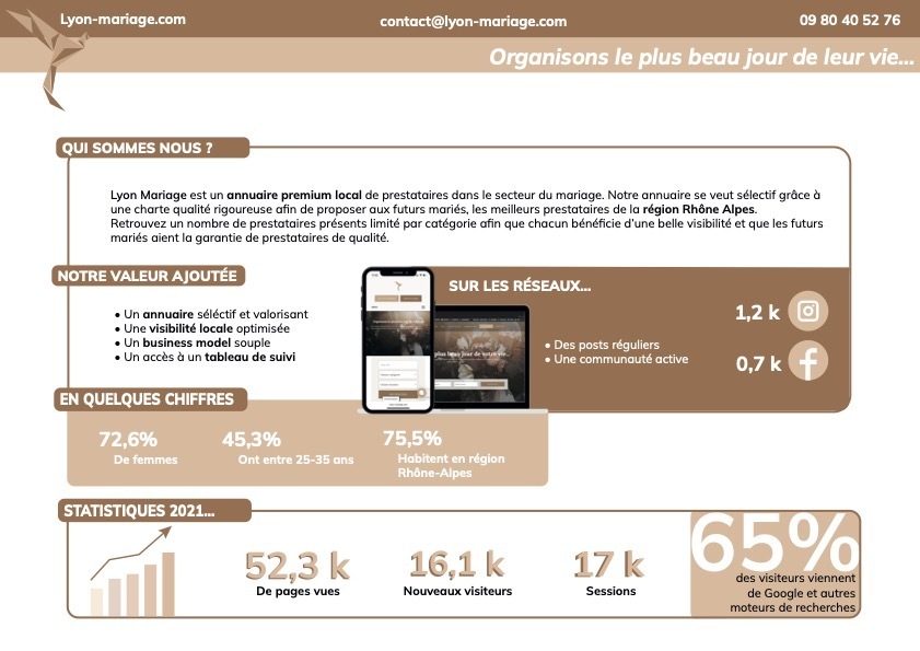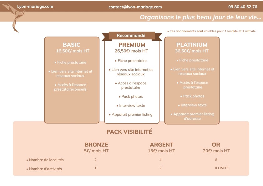 Lyon-mariage.com vous permet de promouvoir votre savoir-faire et vos prestations sur le digital. Pour ce faire, nous vous proposons des offres adaptées à votre saisonnalité et vos besoins.